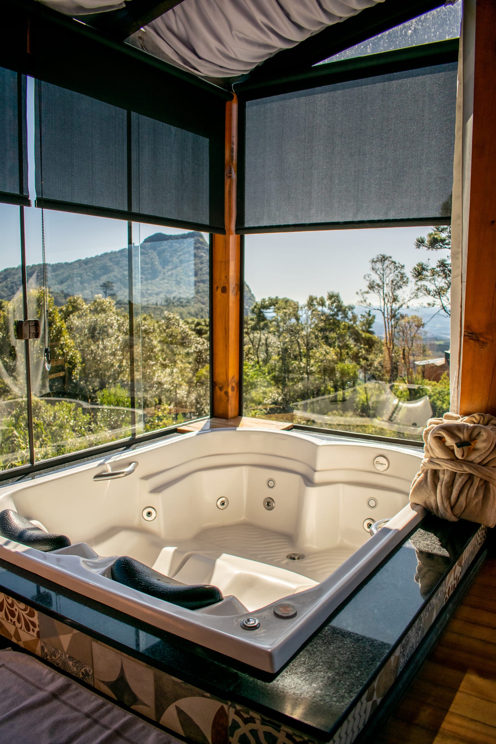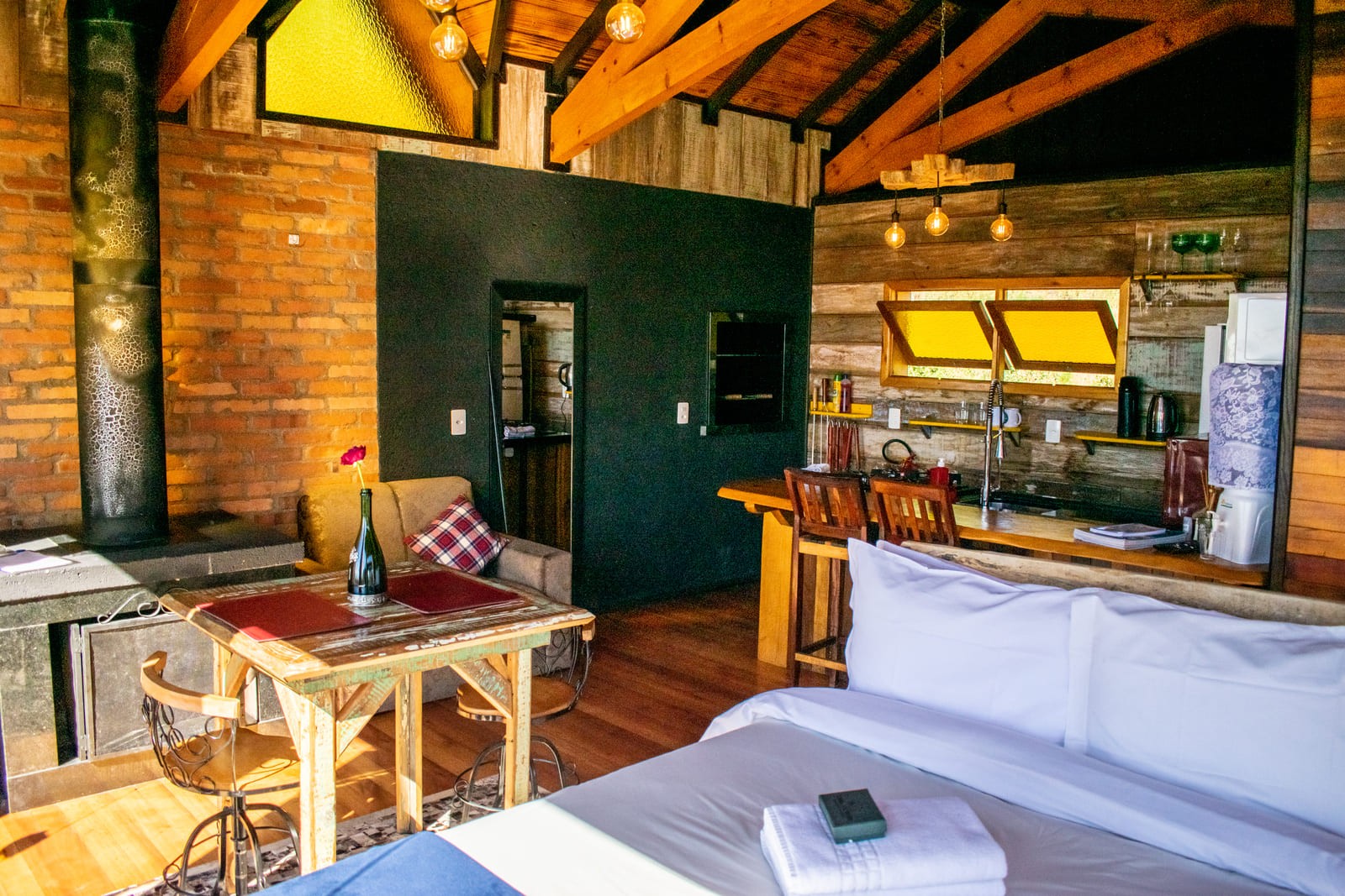 Desfrute da Cabana Estrela, um equilíbrio entre design moderno e aconchego rústico. Ideal para 2 pessoas, com sala conjugada, sofá, lareira, cama, cozinha e hidromassagem. Destaque para a cama que se estende até a varanda. Paredes de vidro oferecem uma vista incrível. Varanda em deck para fotos. Cozinha completa com churrasqueira.
