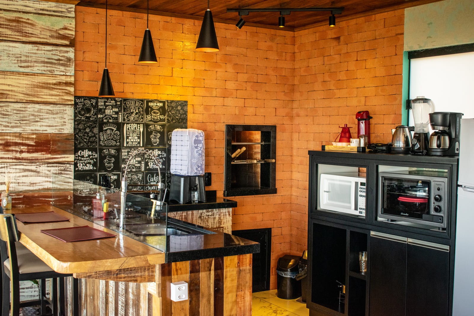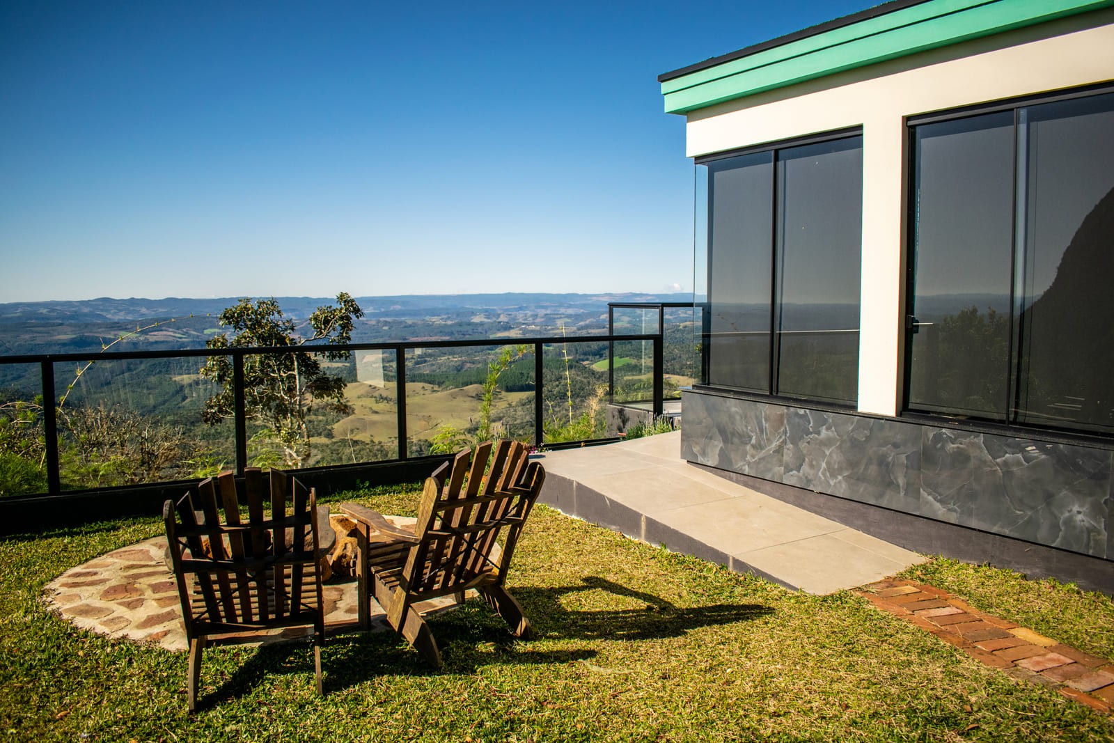 No Chalé Águia, desfrute da vista para o Costão do Frade. Design moderno e interior rústico para 4 pessoas. Sala com sofá, lareira e hidromassagem. Paredes de vidro para apreciar a paisagem. Varanda em deck para fotos incríveis. Cozinha completa.