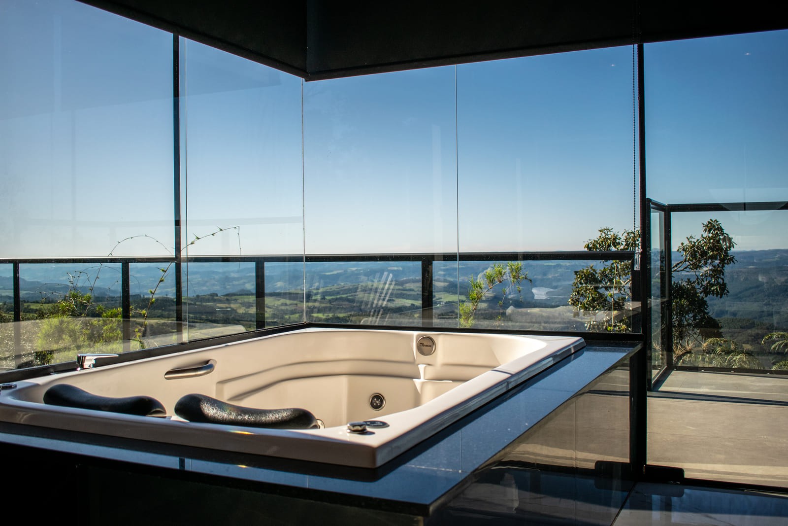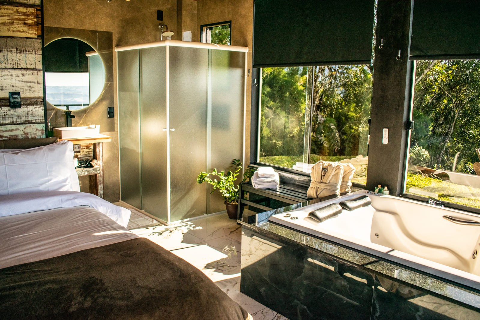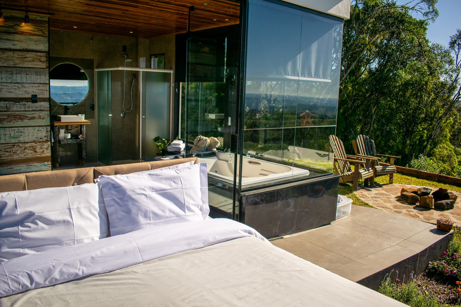 Desfrute da Cabana Estrela, um equilíbrio entre design moderno e aconchego rústico. Ideal para 2 pessoas, com sala conjugada, sofá, lareira, cama, cozinha e hidromassagem. Destaque para a cama que se estende até a varanda. Paredes de vidro oferecem uma vista incrível. Varanda em deck para fotos. Cozinha completa com churrasqueira.