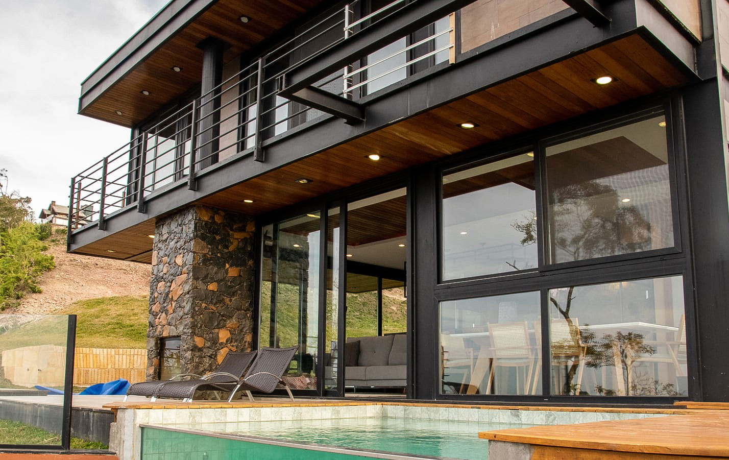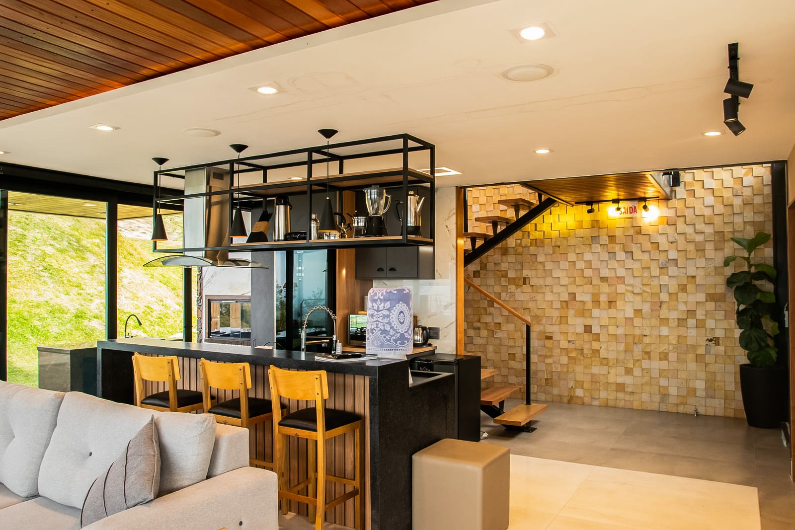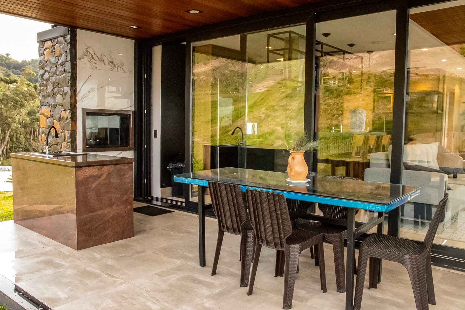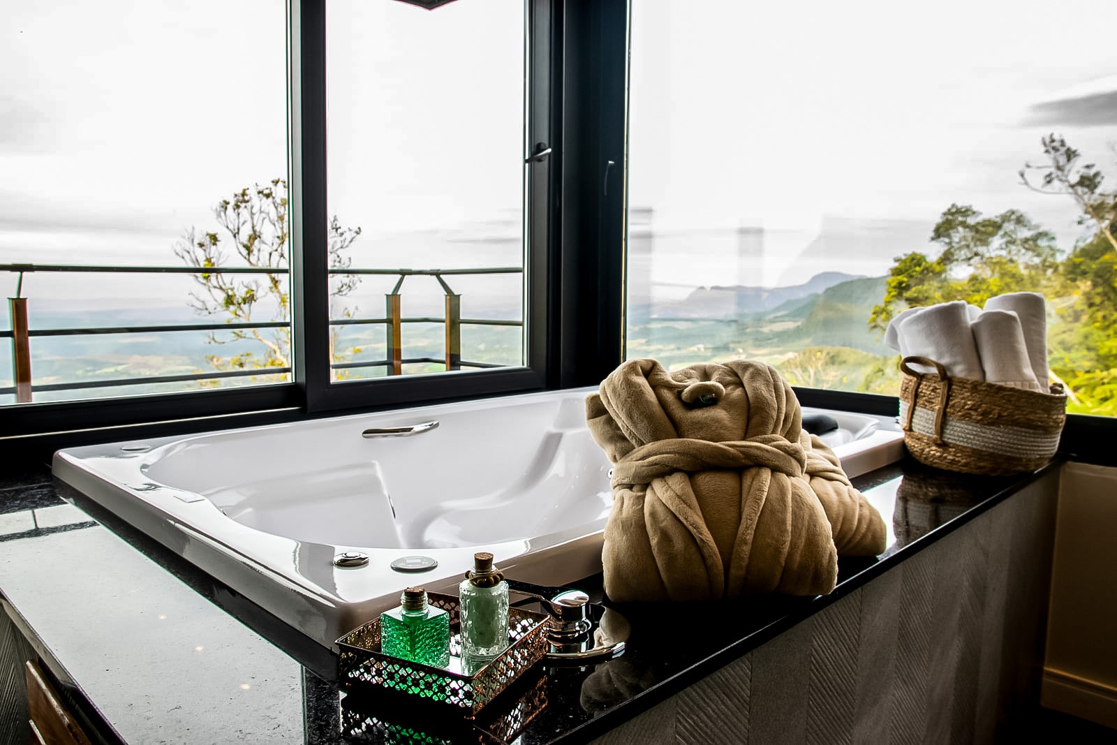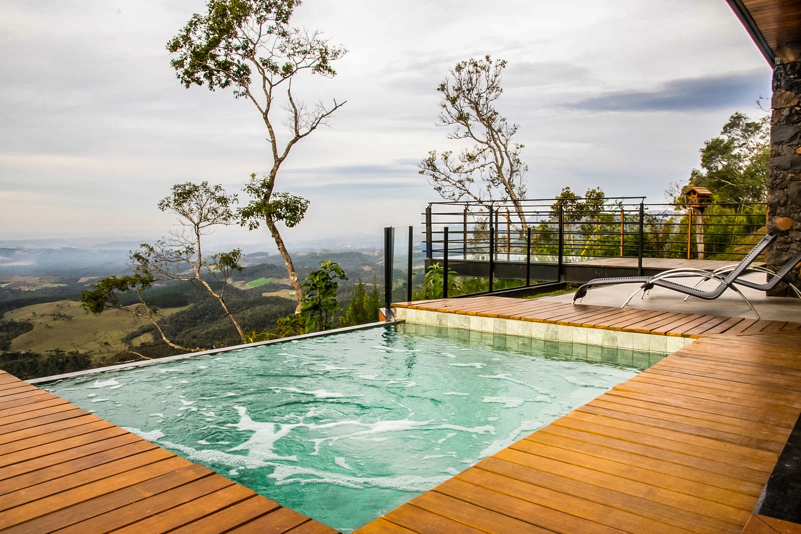 No Chalé Águia, desfrute da vista para o Costão do Frade. Design moderno e interior rústico para 4 pessoas. Sala com sofá, lareira e hidromassagem. Paredes de vidro para apreciar a paisagem. Varanda em deck para fotos incríveis. Cozinha completa.