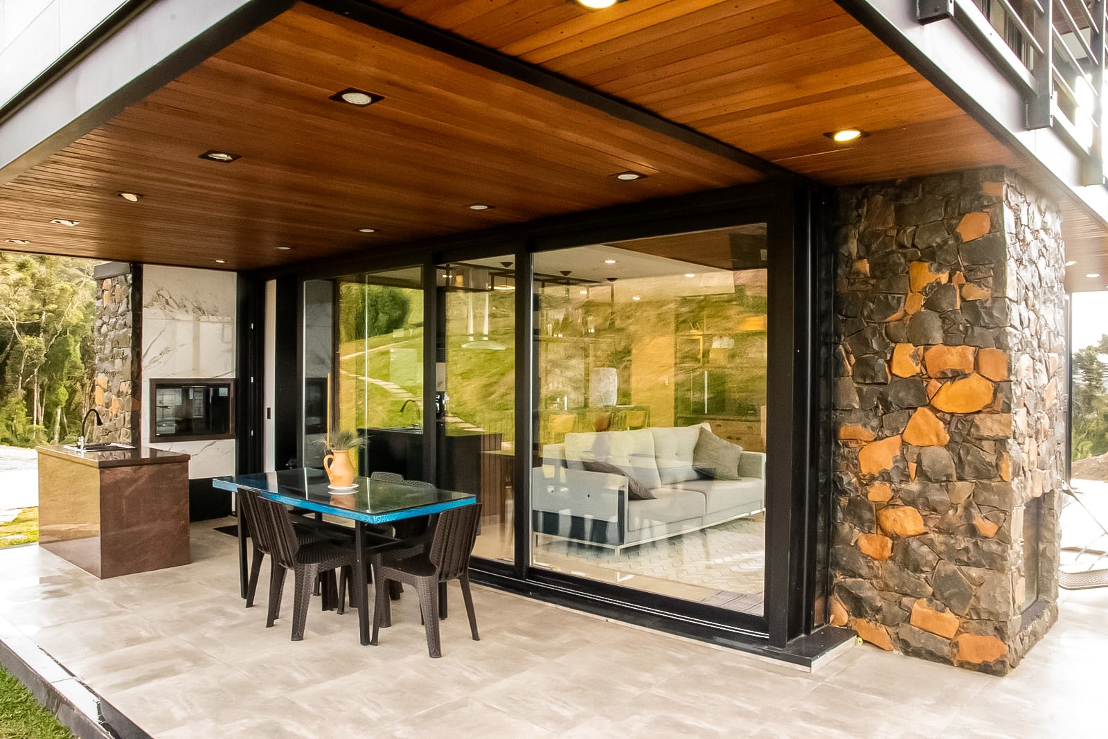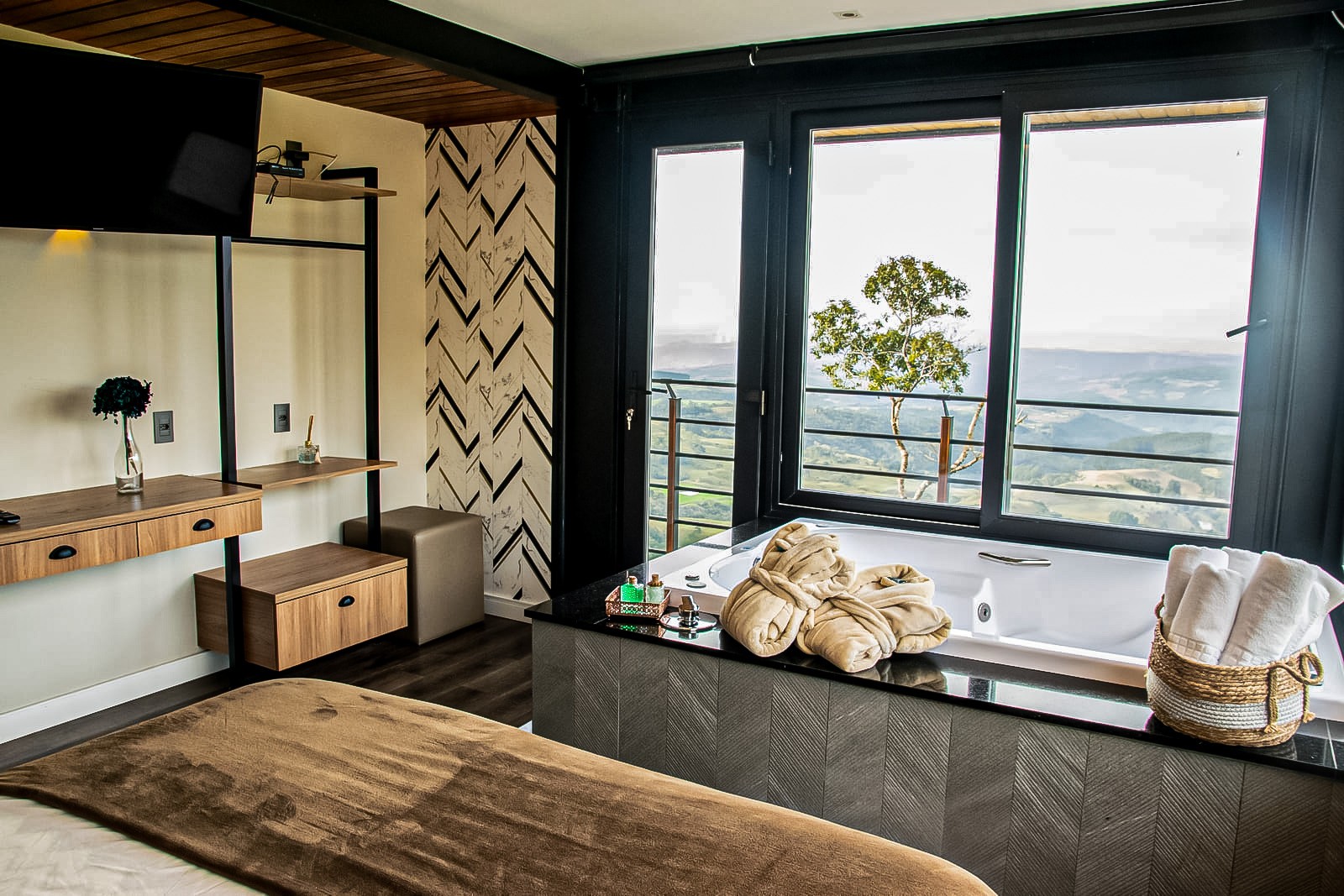 Desfrute da Cabana Estrela, um equilíbrio entre design moderno e aconchego rústico. Ideal para 2 pessoas, com sala conjugada, sofá, lareira, cama, cozinha e hidromassagem. Destaque para a cama que se estende até a varanda. Paredes de vidro oferecem uma vista incrível. Varanda em deck para fotos. Cozinha completa com churrasqueira.