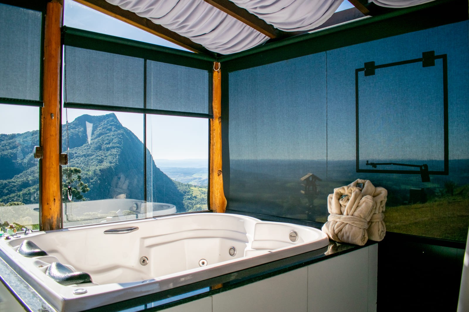 No Chalé Águia, desfrute da vista para o Costão do Frade. Design moderno e interior rústico para 4 pessoas. Sala com sofá, lareira e hidromassagem. Paredes de vidro para apreciar a paisagem. Varanda em deck para fotos incríveis. Cozinha completa.