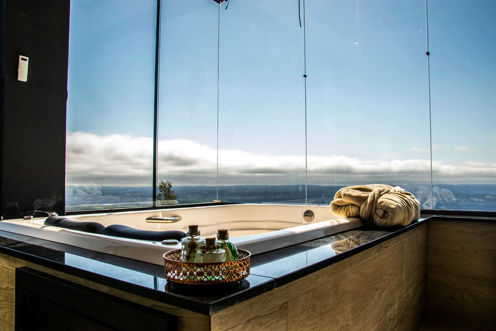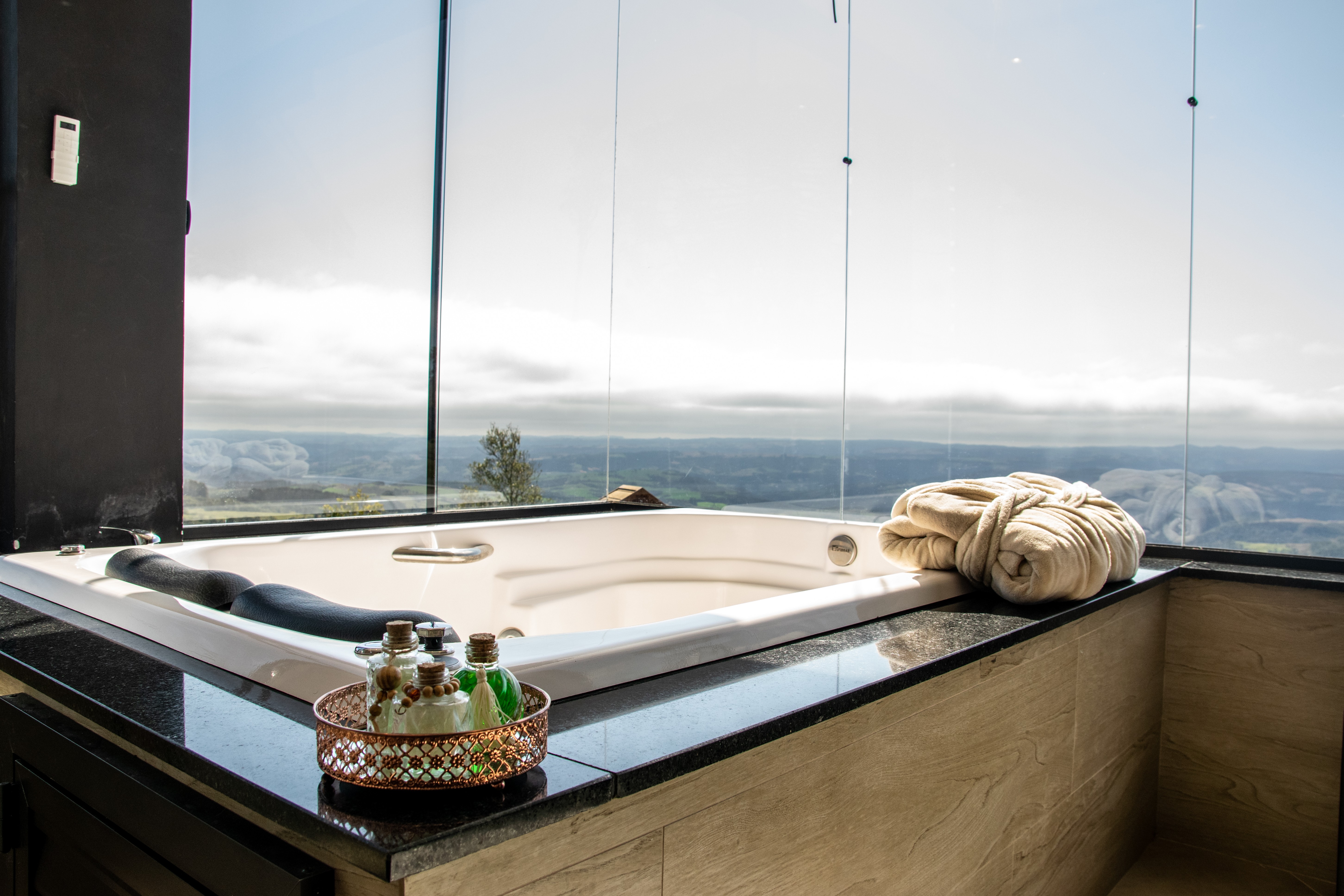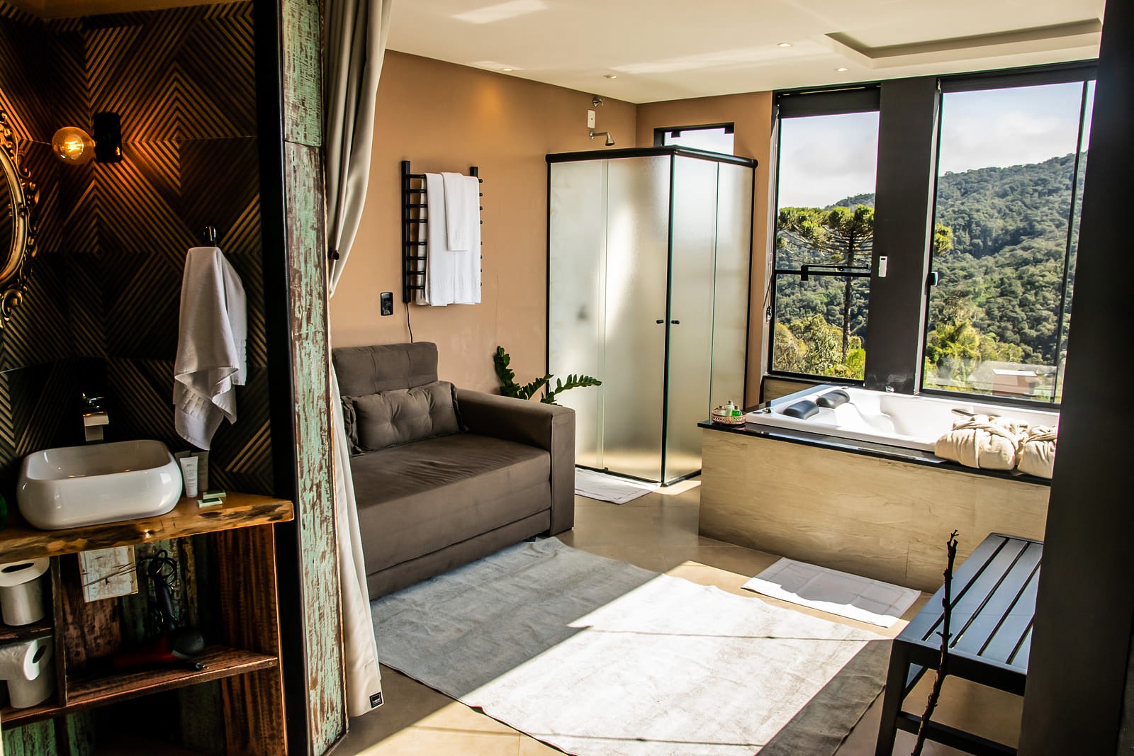 Desfrute da Cabana Estrela, um equilíbrio entre design moderno e aconchego rústico. Ideal para 2 pessoas, com sala conjugada, sofá, lareira, cama, cozinha e hidromassagem. Destaque para a cama que se estende até a varanda. Paredes de vidro oferecem uma vista incrível. Varanda em deck para fotos. Cozinha completa com churrasqueira.